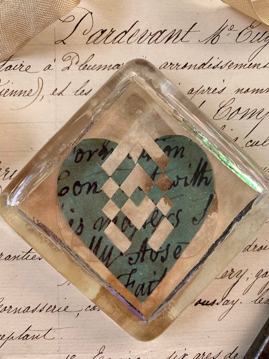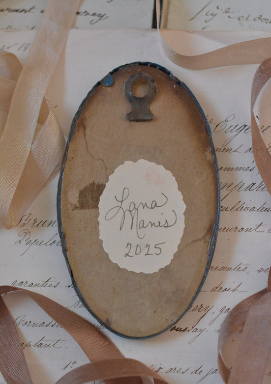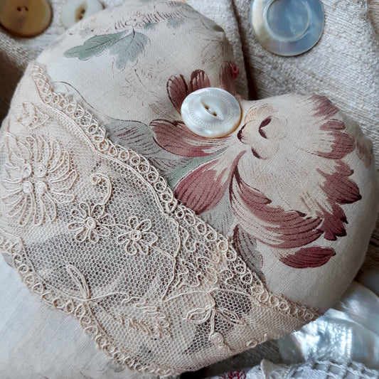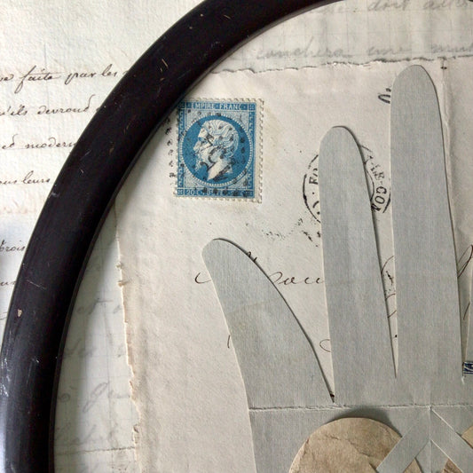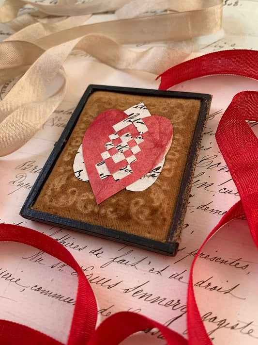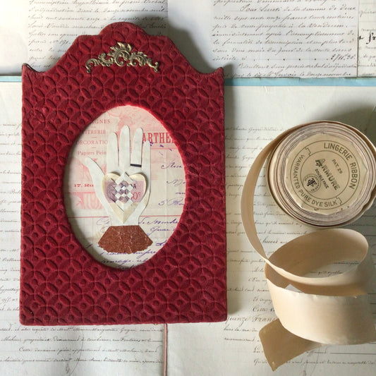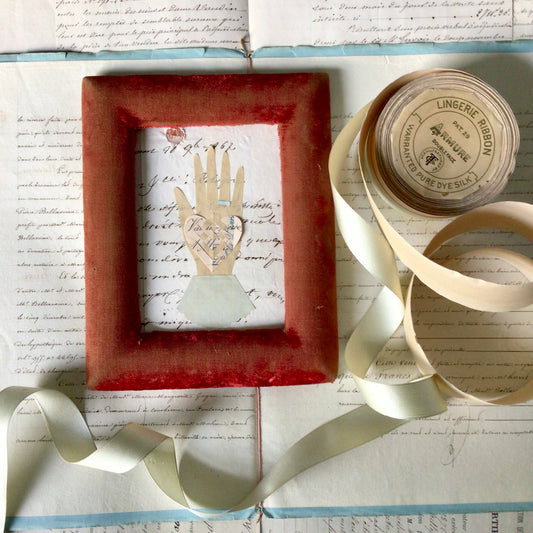 Each valentine is handmade by me. I am a magpie of sorts, collecting antique and vintage treasures: paper... French letters, envelopes, ledger pages, old postage stamps, book plates, fabrics: even the tiniest scraps... buttons, laces... broken bits of this and that, old frames, and then I reunite them to make one-of-a-kind tokens of love and friendship. My collection of antique frames (velvet frames, daguerreotype frames, metal frames, etc.) has diminished quite a bit over the years. I don't have many left and it's getting harder to find them.