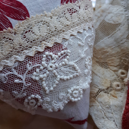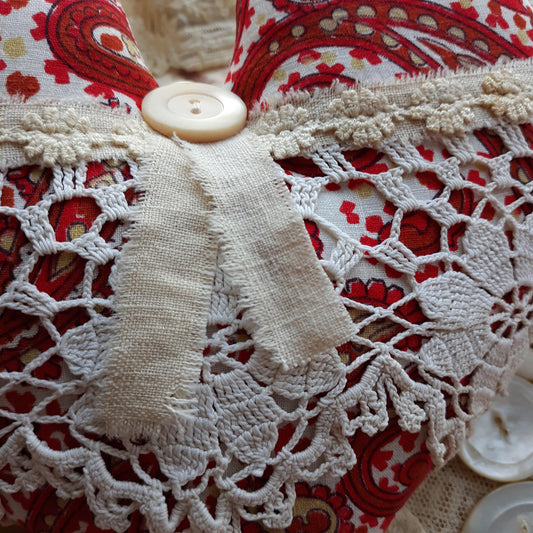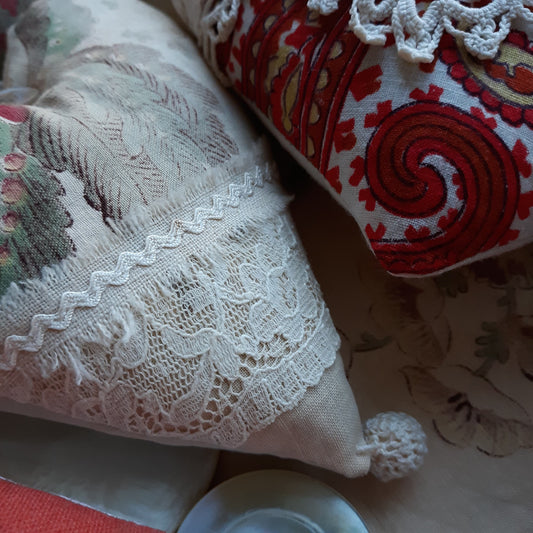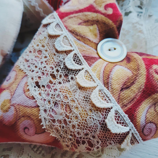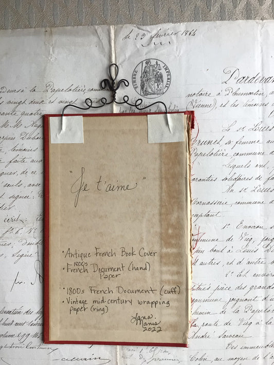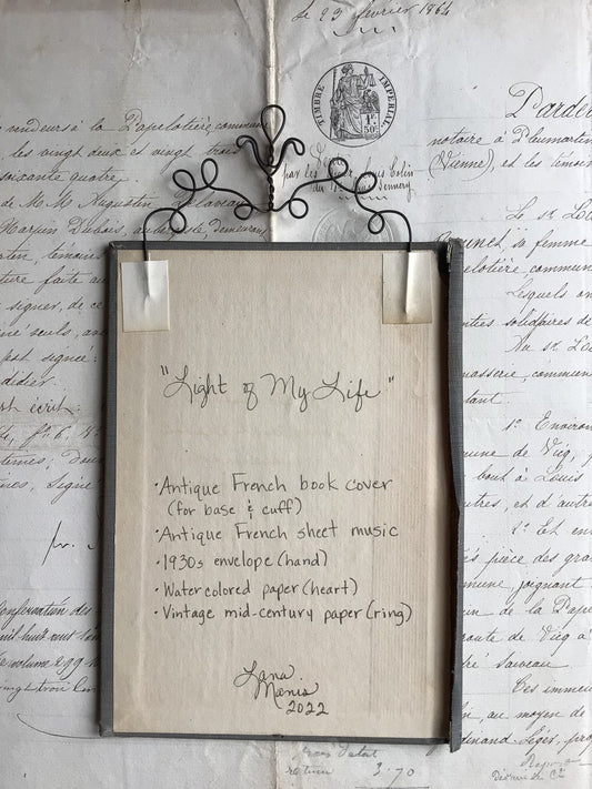 Each valentine is handmade by me. I am a magpie of sorts, collecting antique and vintage treasures: paper... French letters, envelopes, ledger pages, old postage stamps, book plates, fabrics: even the tiniest scraps... buttons, laces... broken bits of this and that, old frames, and then I reunite them to make one-of-a-kind tokens of love and friendship. My collection of antique frames (velvet frames, daguerreotype frames, metal frames, etc.) has diminished quite a bit over the years. I don't have many left and it's getting harder to find them.