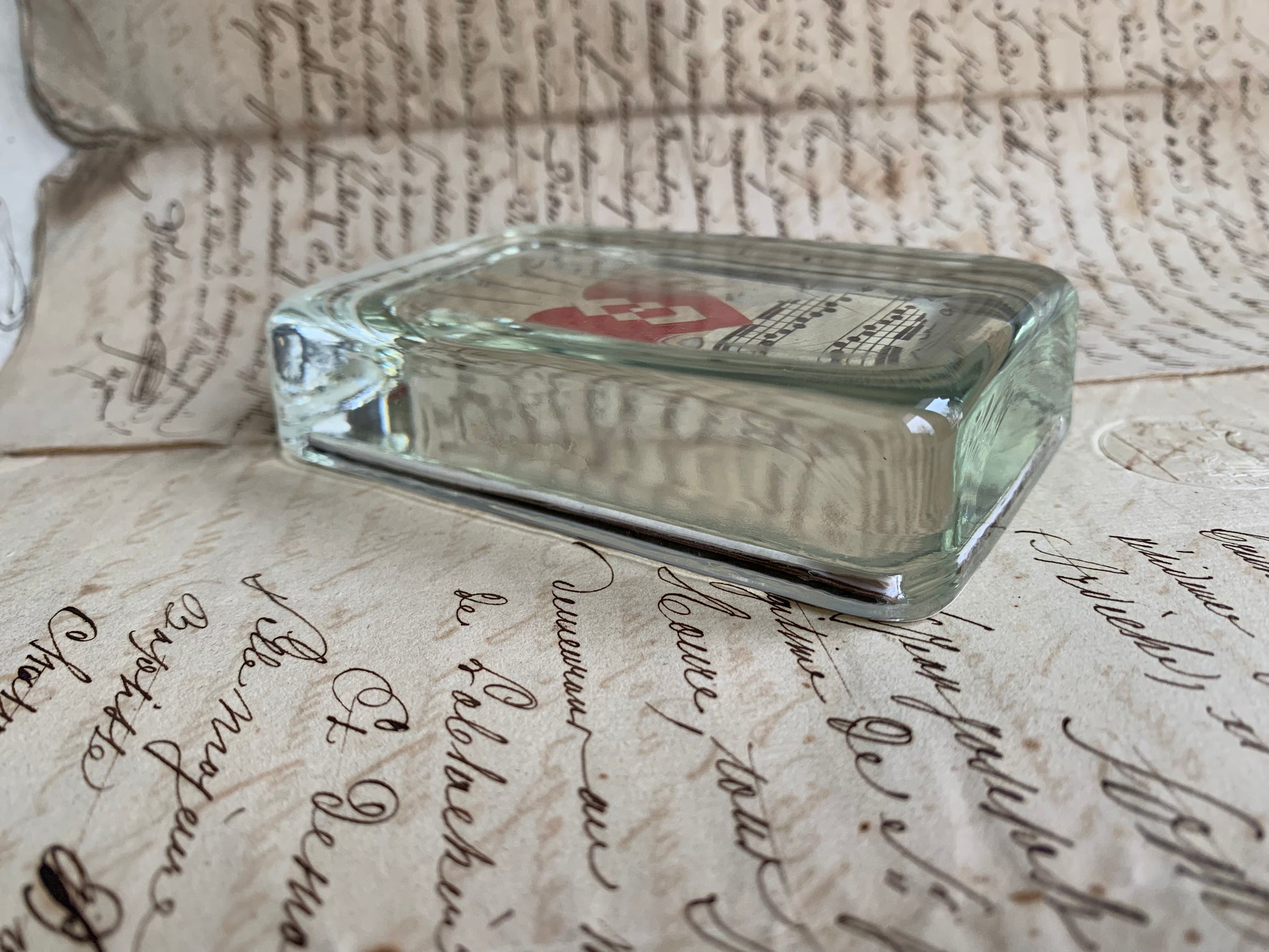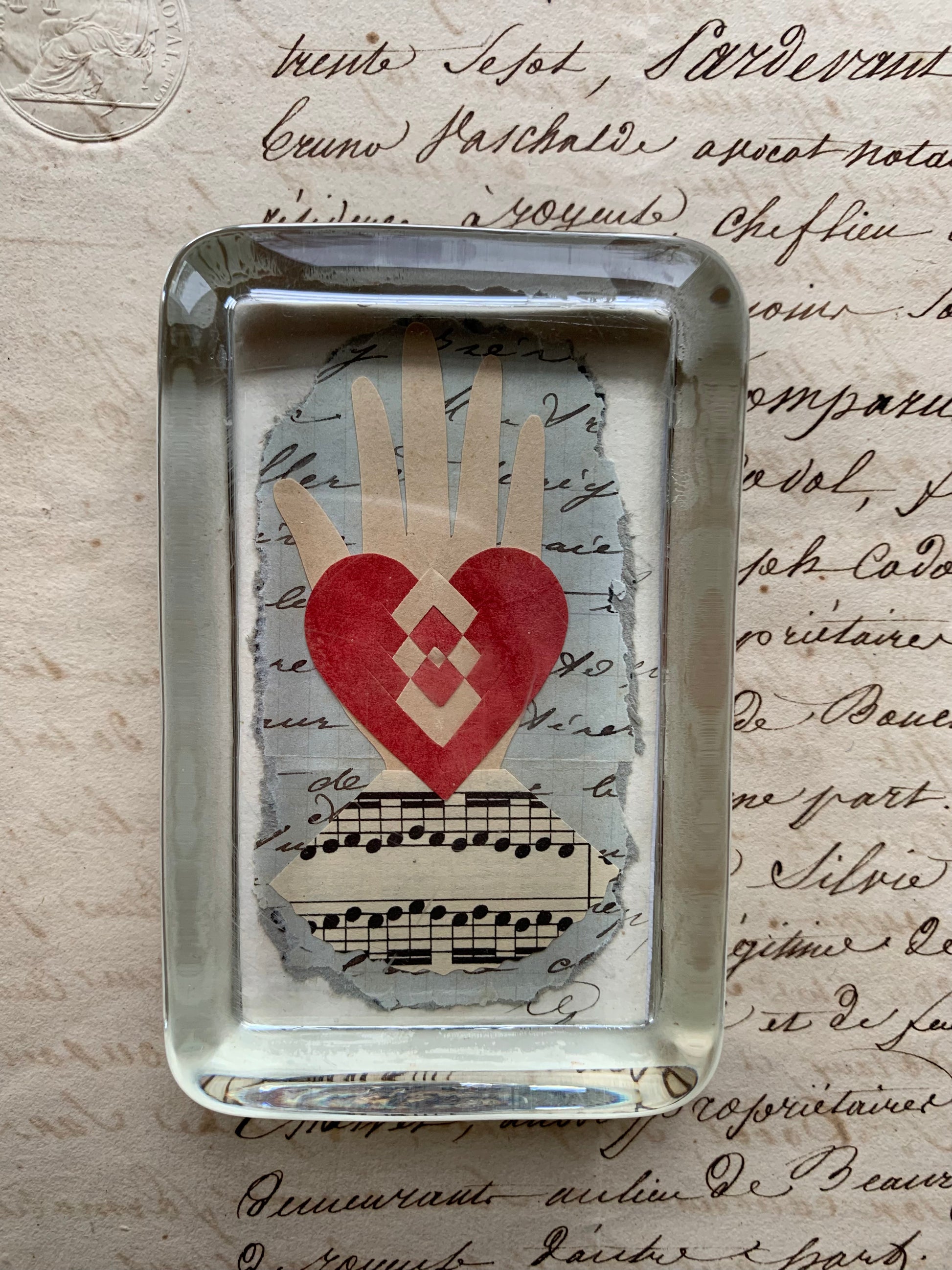 The design in this paperweight consists of a vintage French letter for the background, vintage envelope paper for the hand, aged and painted paper for the heart, and antique sheet music for the cuff. The back is covered with an antique photo I received in an ephemera bundle from France.
