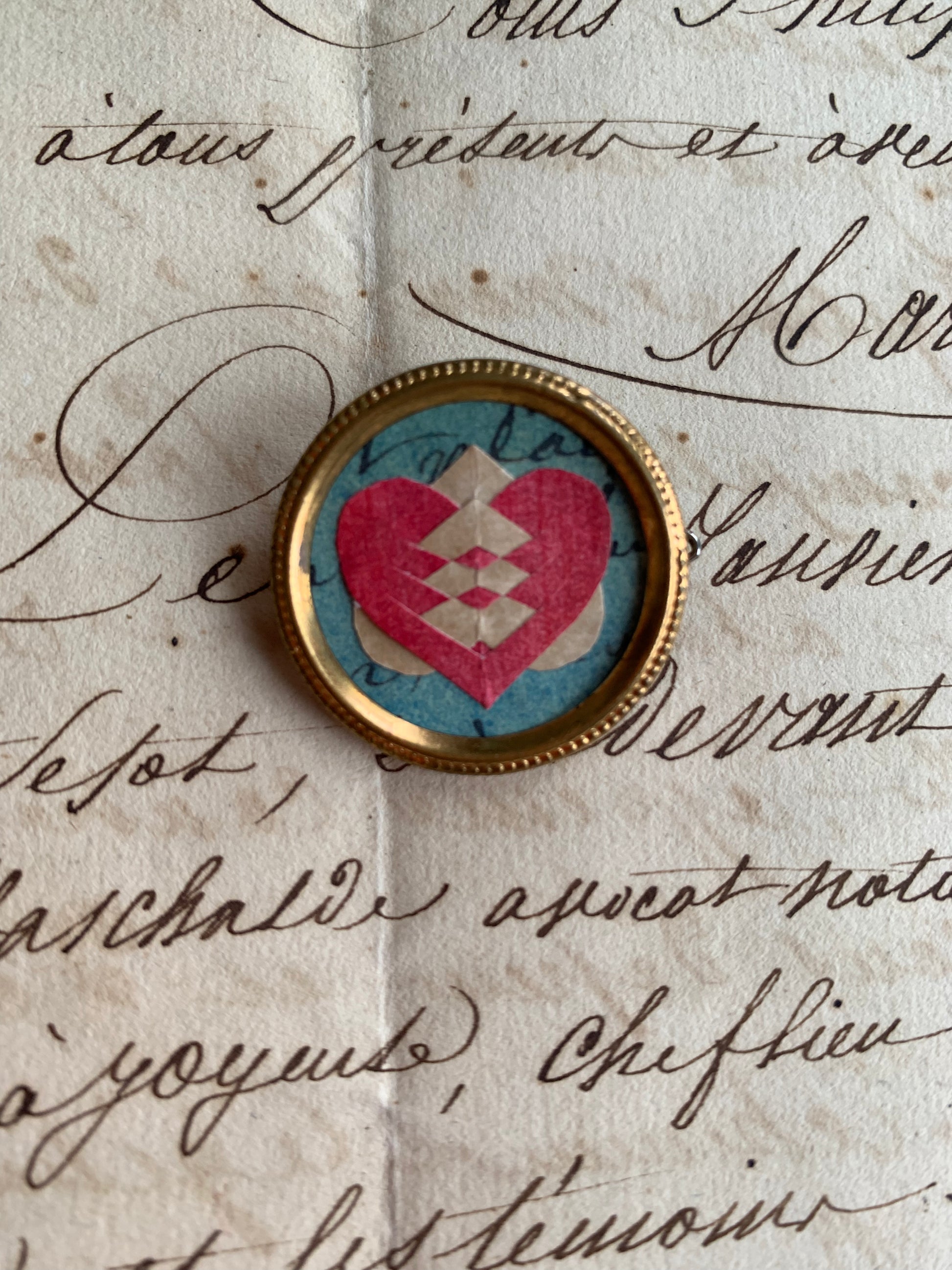 Sweet and to the point… From the Heart. These double hearts are made from aged, stained, watercolored paper. The background paper is also aged, watercolored paper that was printed with a copy of an 18th century indentured servant letter.