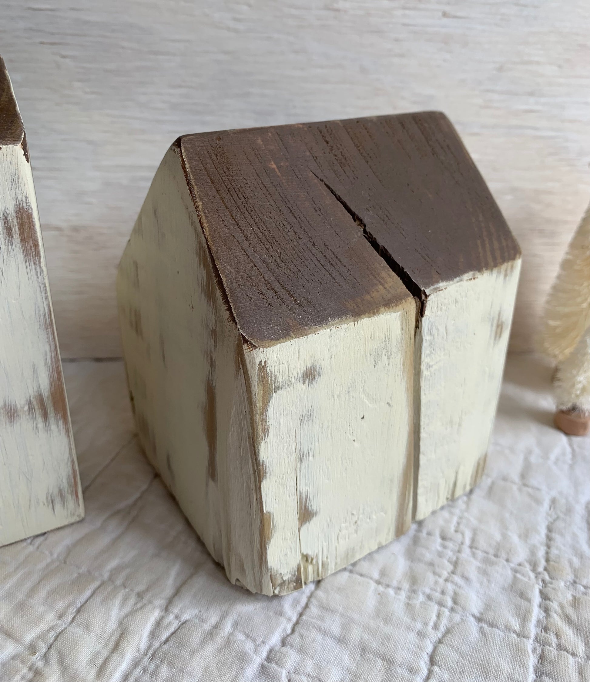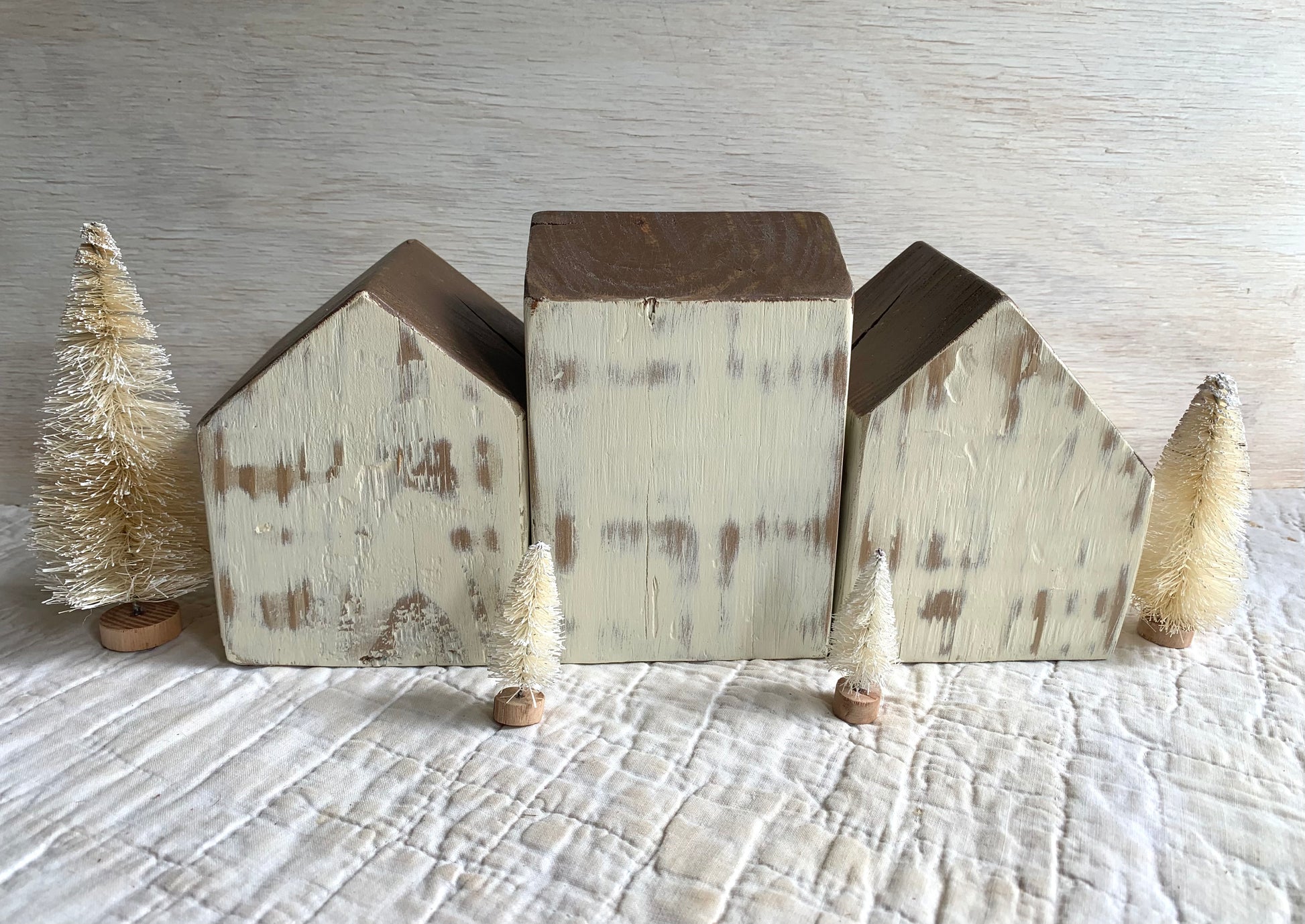 I’ve scavenged old boards and wood blocks from the barn to make country village houses.