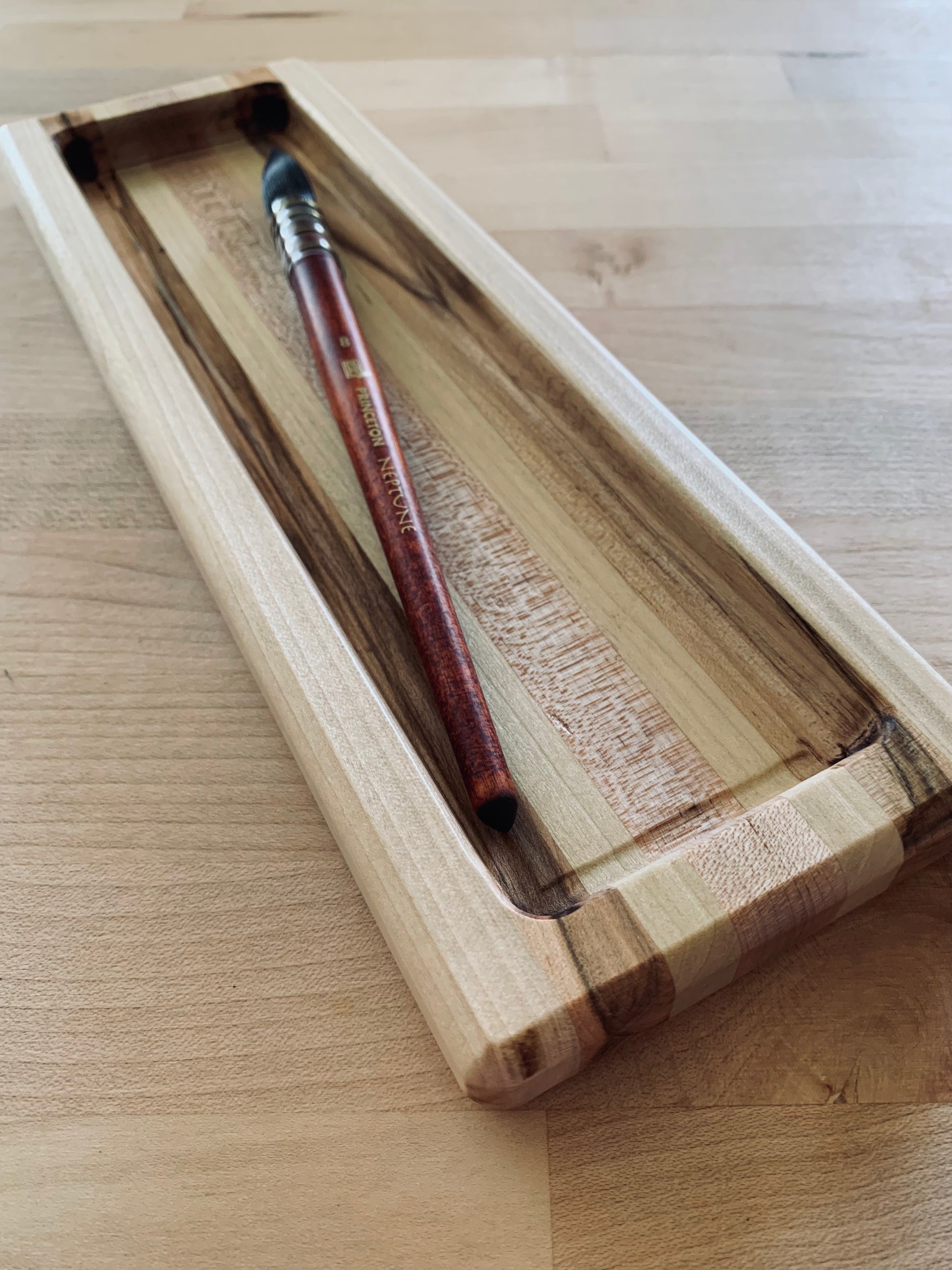 This long, handcrafted wood tray showcases the beauty of fine woodworking and natural materials. Made by a 4th-generation woodworker, it features a striking blend of locally sourced poplar, maple, ambrosia maple, and oak, carefully arranged to highlight contrasting grain patterns and warm, organic tones. The smooth, carved interior and softly rounded edges reflect skilled craftsmanship and attention to detail.
