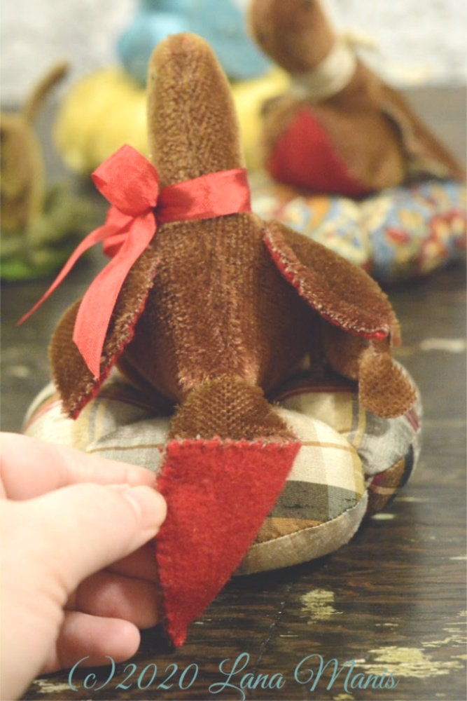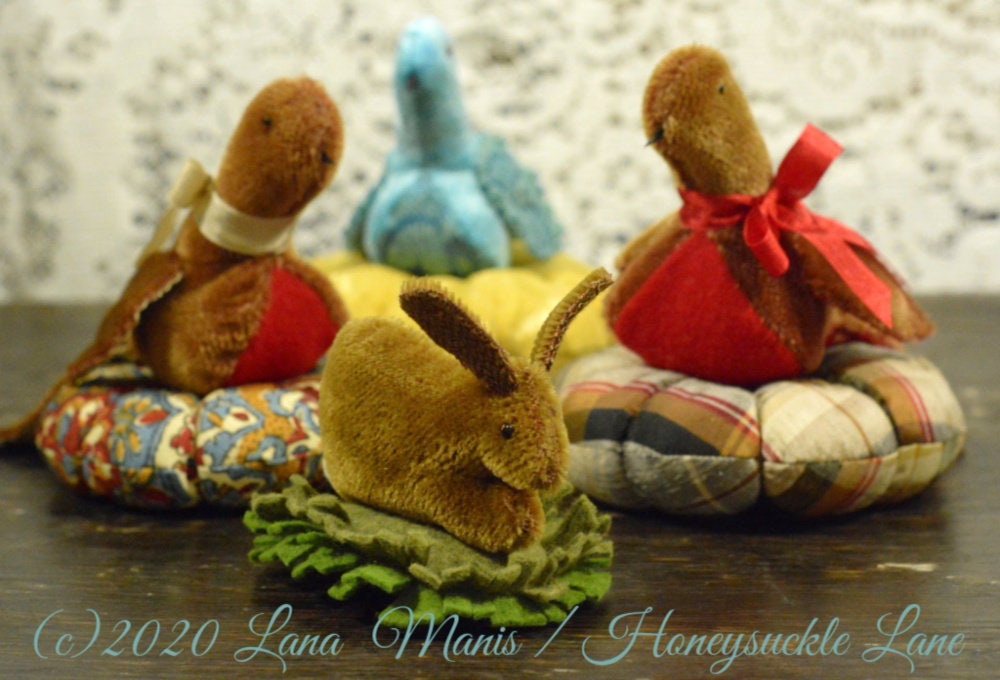 This bird is hand-stitched using vintage, sparse mohair and recycled wool. She sits on a cushion made from plaid silk dupioni. I have used recycled wool for the lining of her wings and tail, as well. I whittled the tiny beak from a piece of ebony leftover from one of my husband's guitar making projects. Vintage seam binding is used for the decorative bow.
