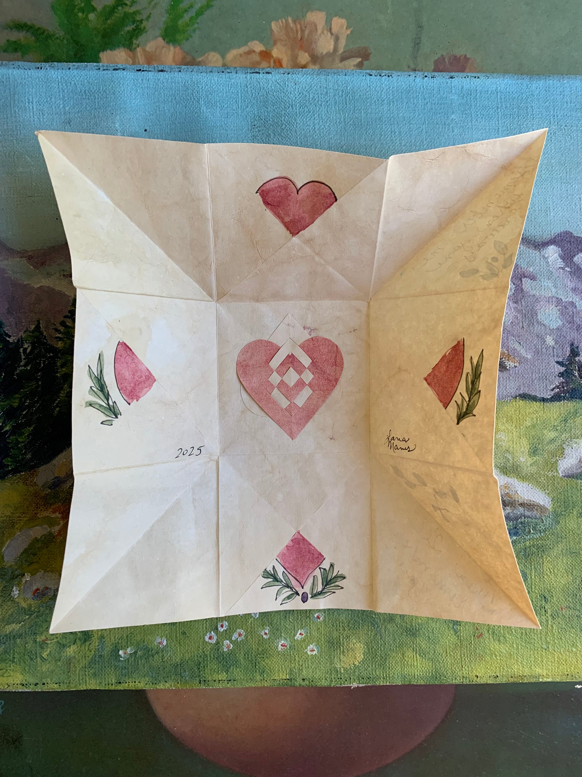 Messages of LOVE are written on these Valentines which are folded in a precise intricacy so that as you open it according to the numbered sections, you read a verse or a phrase, and tiny hand painted pictures are revealed. The very inner most part of these Valentines have woven paper hearts or a woven paper heart and hand. They are sometimes tricky for the recipient to re-fold, which is part of the charm of the puzzle purse.